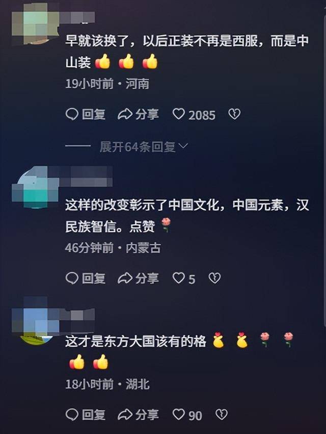但还有很多网友认为“早就该换了”,此举改革蛮不错的,中国的正装本来就不是西服,换上中国元素的中式服装,更能彰显我国的传统文化,这也是东方大国该有的风格。