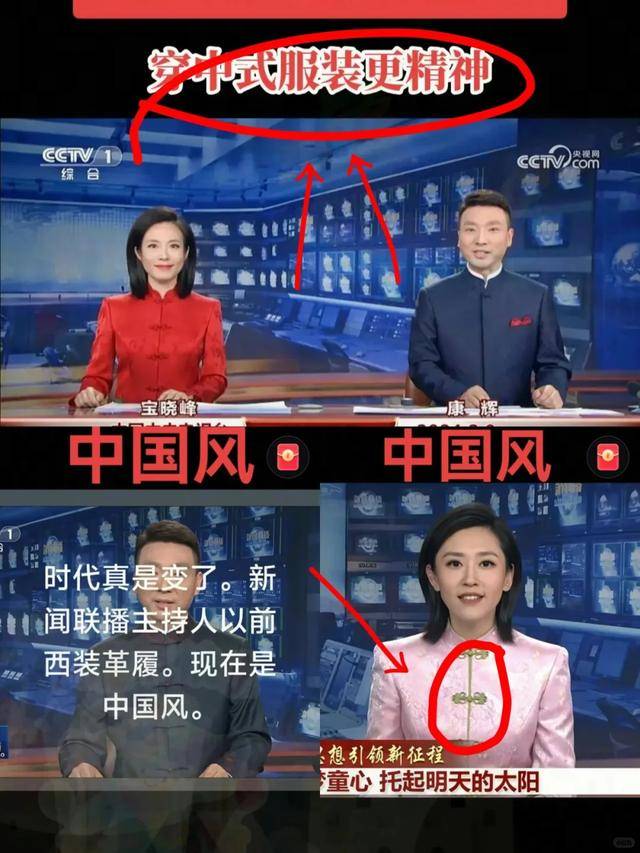 就像是女主持宝晓峰,曾穿过一套中国红的盘扣新中式上衣,口红仿佛也配套一般,涂了红色的口红;而康辉早在去年,也已经穿过改良中山装了。